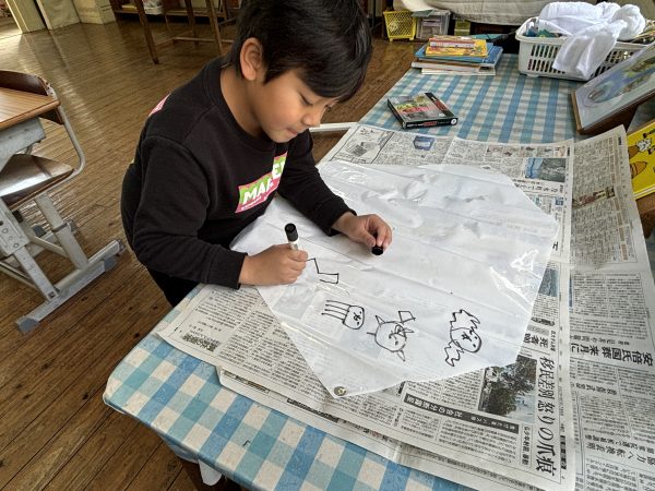 自分の好きなキャラクターの絵を描いて、足や糸をつけて校庭へ!
