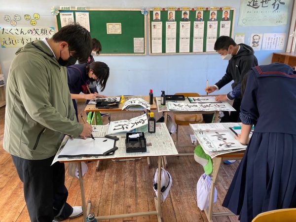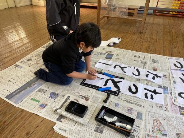 2・3校時に「書き初め」を行いました。いつも半紙に書いていますが、今日は条副紙に清書しました。