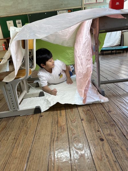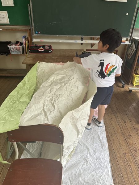 くしゃくしゃにした紙を組み合わせて、椅子に貼って秘密基地を作ったり、