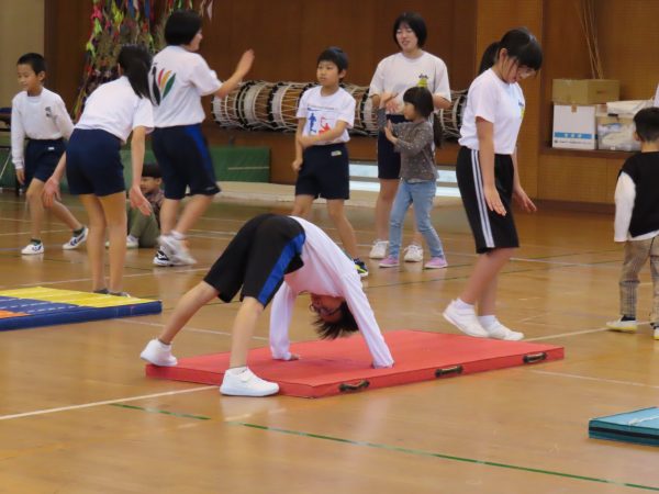 今回は、全校児童生徒合同で、「マット運動」の授業を行いました。