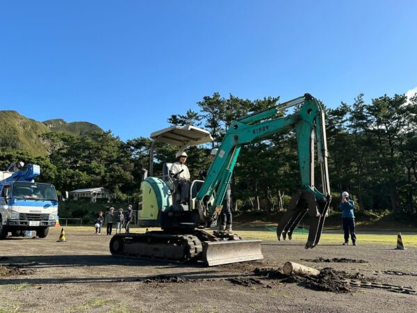ユンボでは、丸太を運んだり、土を削ったりと操作の仕方を教えていただきました。