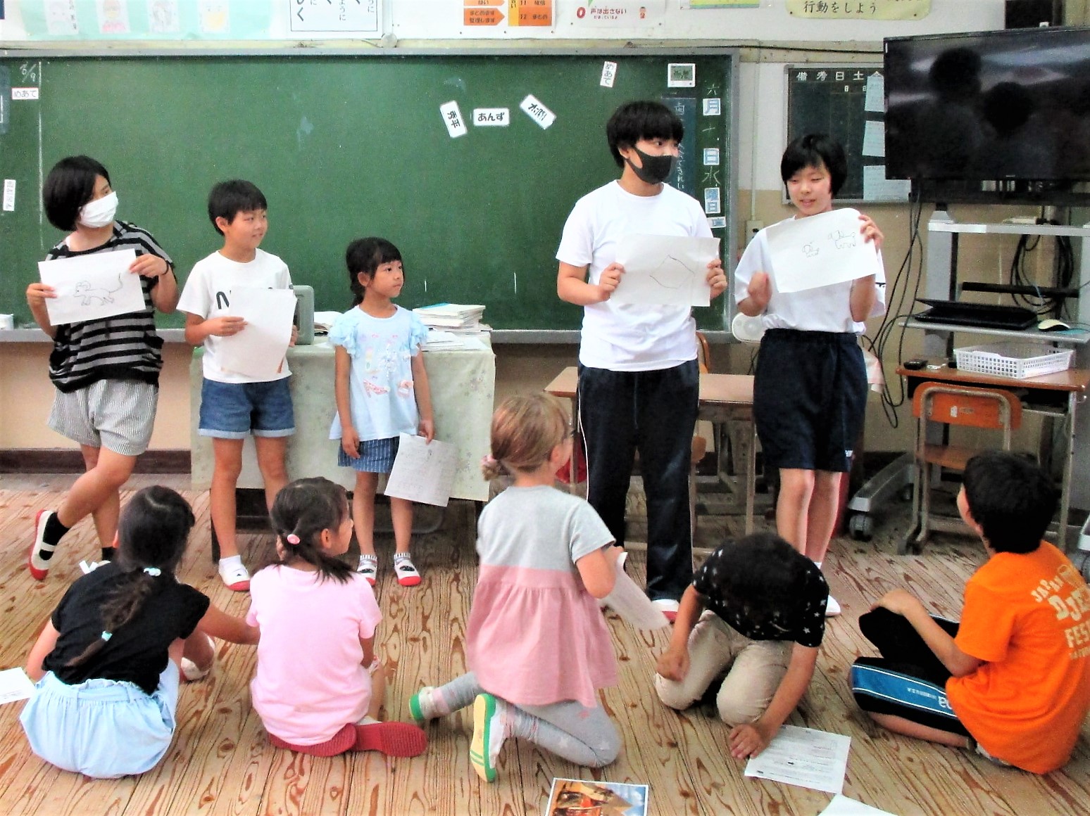 本日行われる予定だった,水泳大会が大雨により延期になりました。ちょっと残念。雨の日と言えば…みんなで雨の日の過ごし方を考えて,「絵しりとり」をしたことがありました。中には,「この絵何?」と思われるものもあって,いろいろ言い当てていくのがとても楽しそうでした。