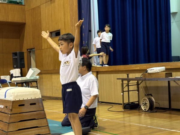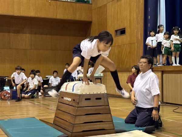 上手に飛べました!マット運動や跳び箱など体育の発表もありました。