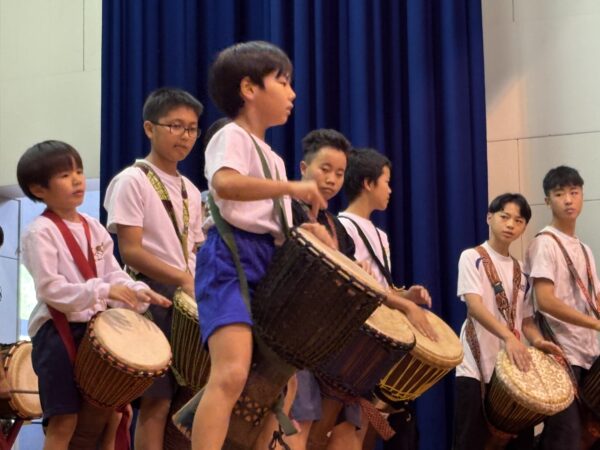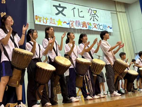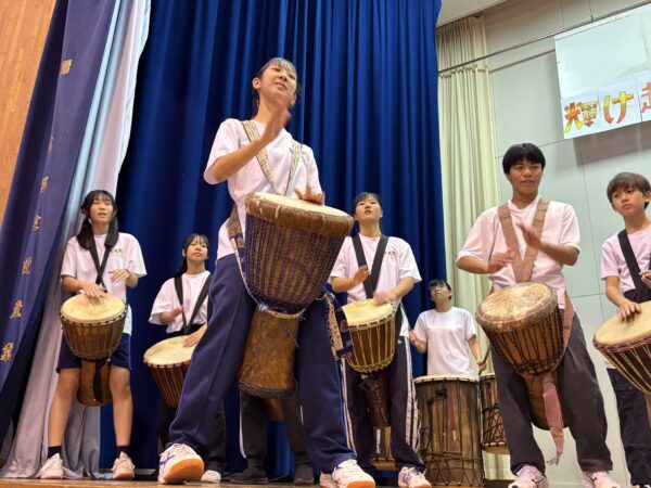 最後には、全校児童生徒に加え、ジャンベ留学生も参加し、迫力あるジャンベ演奏とダンスを披露しました。