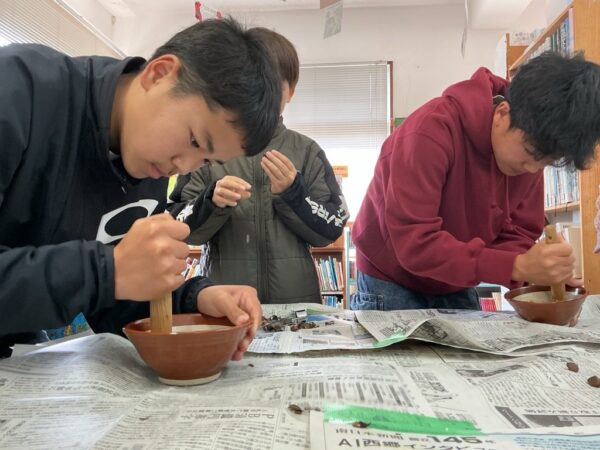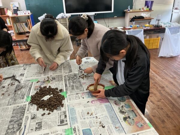地域の方を講師にお招きし、子どもたちは一つひとつ椿の実を手で潰し、すりつぶし、蒸した実から丁寧に油をしぼり取りました。