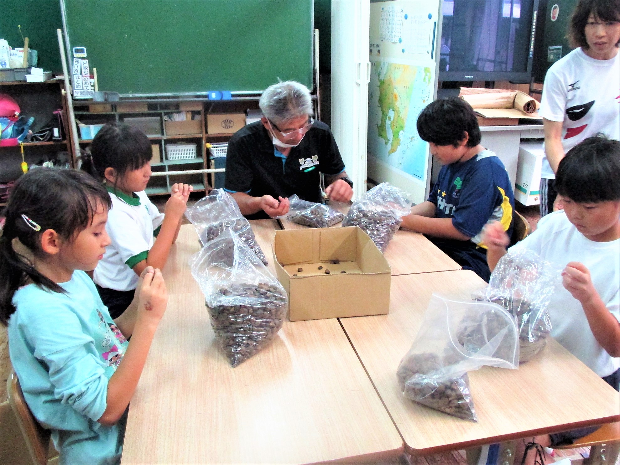 月曜日には,10月始めに収集した椿の種を選別しました。選別する椿の種は,木から直接もぎ取った椿の実の種でしたので,比較的綺麗なものが多く,10キロ近くあった椿の種を1時間程度で選別することができました。後は出荷を待つだけです。そこで得た利益は児童生徒会活動費に当てられるということでした。