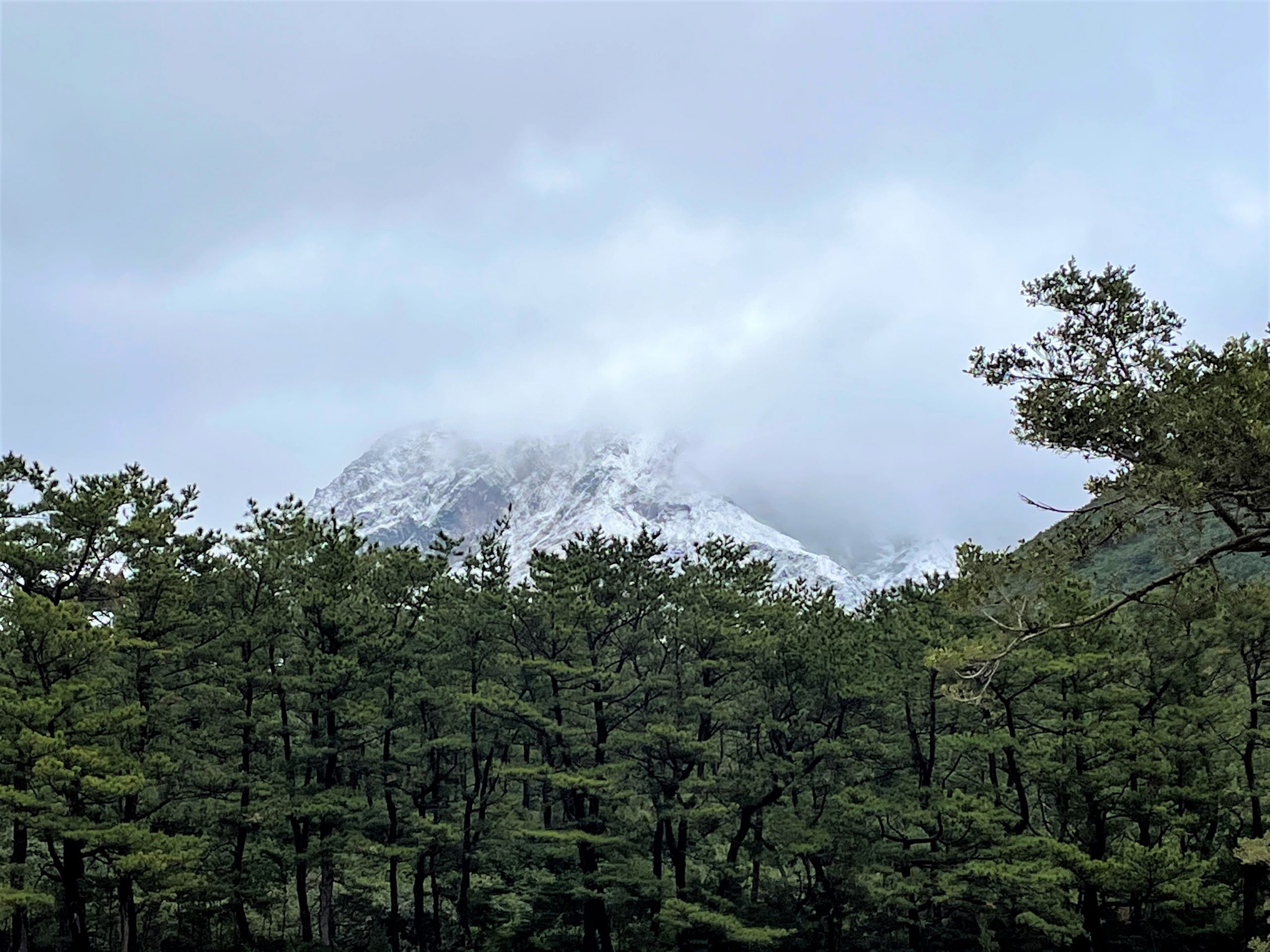 始業式の朝,雪やあられが降りました。学級活動の時間にも降ってきたので「外へ出てみよう!」とシューズのまま急いで外へ出る子ども達。落ちてくる雪を触って,食べて(笑)大さわぎでした。硫黄島に久々の雪。硫黄岳もうっすら雪化粧しています。