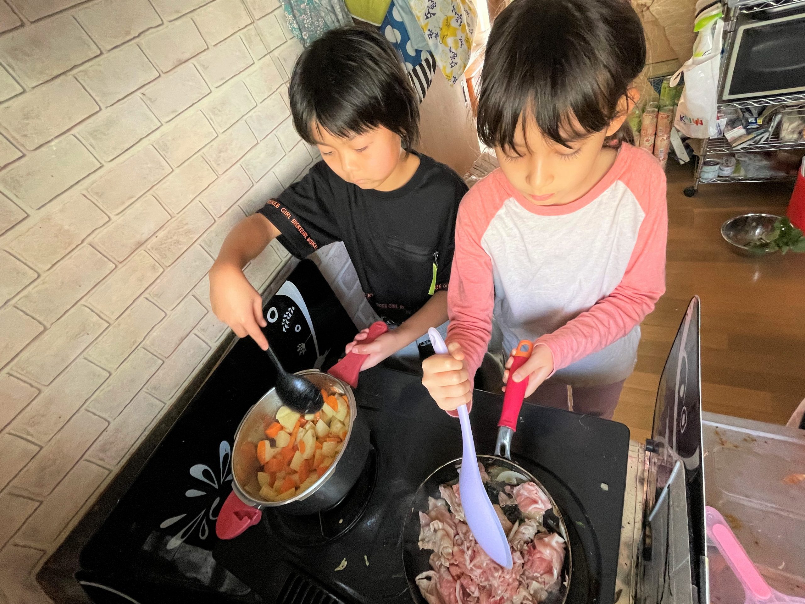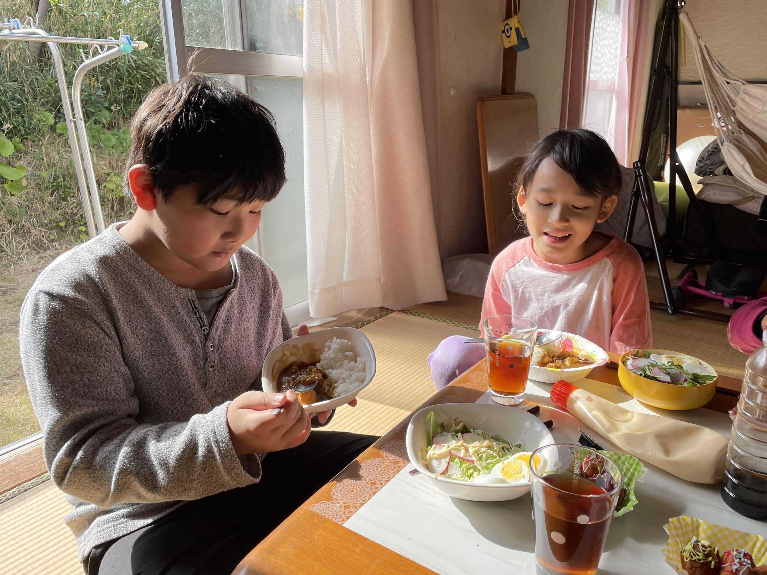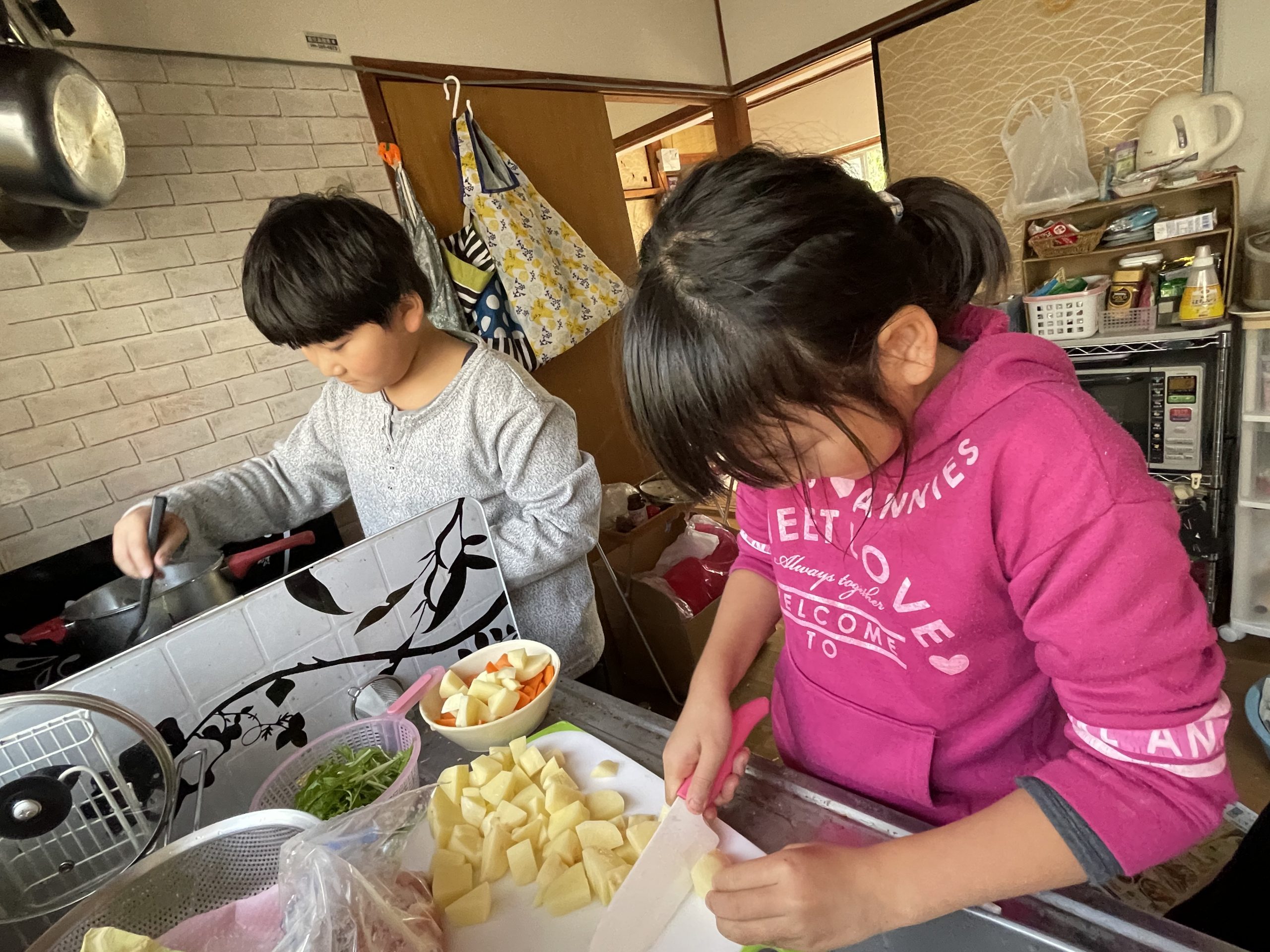 今日はみんなでカレーパーティー!メニューは「①じゃがいもごろごろポークカレー ②水菜とラディッシュのサラダ ③サーターアンダーギー ④ミカン寒天ゼリー」です。デザートは子ども達がお家で作って持ち寄ってくれました。