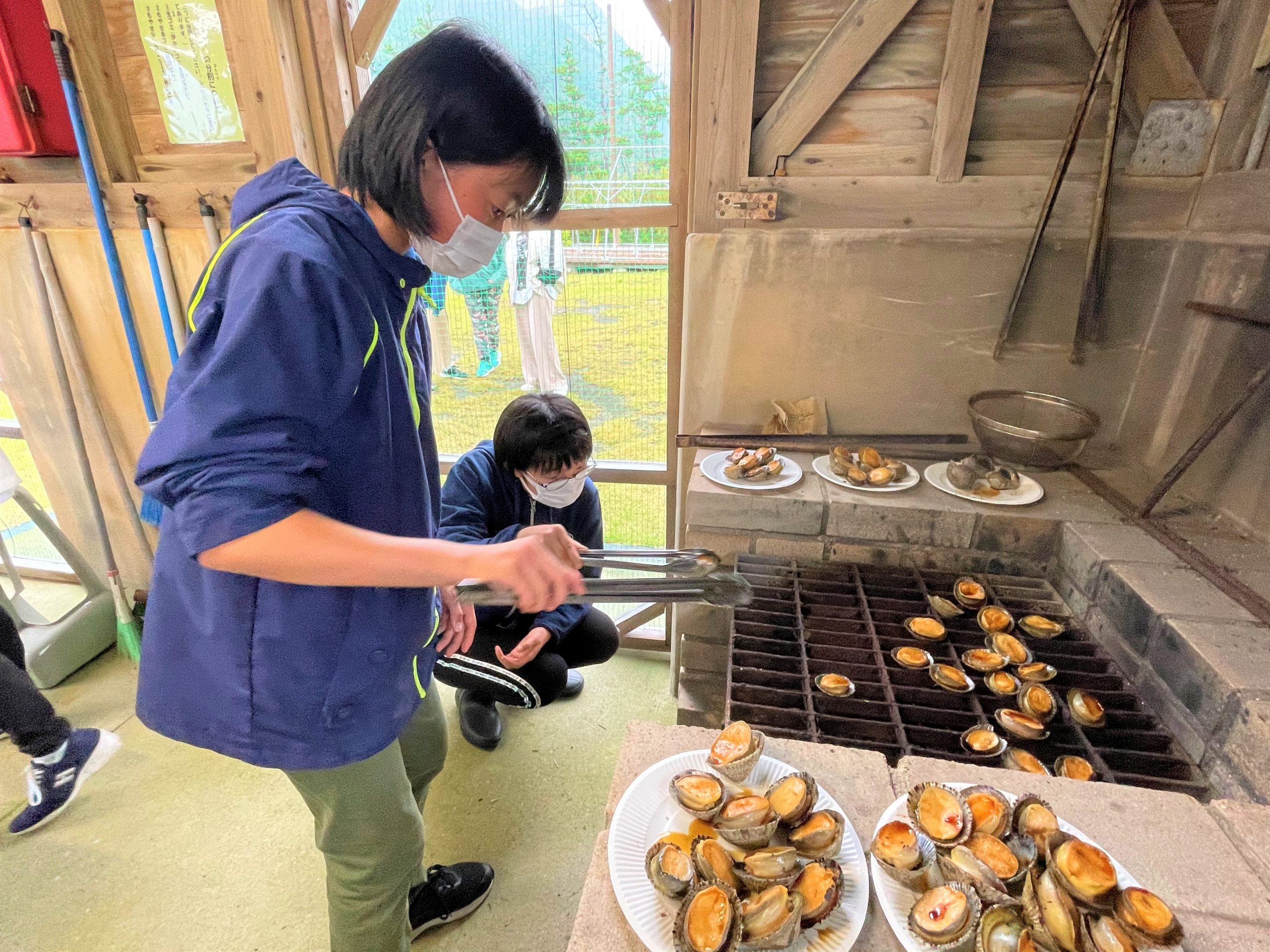 こちらはどんどん焼いていきますよ。「じんがさ」と呼ばれる貝をさっと洗って炭火焼きに。