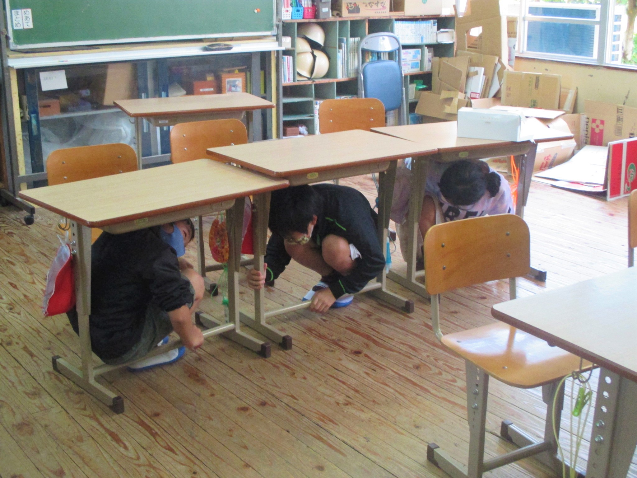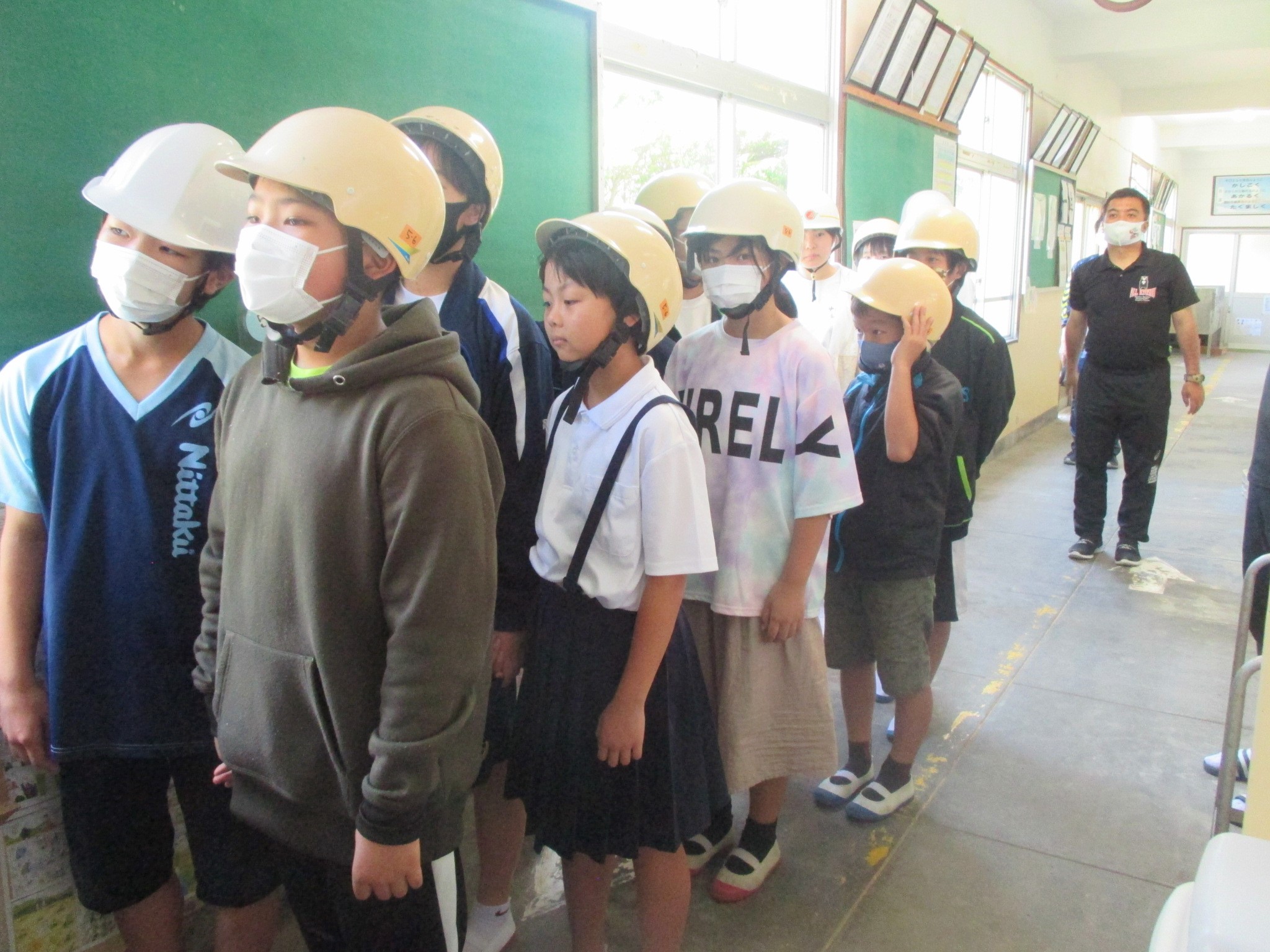 教頭先生の放送を聞いて,机の下から出てきます。ヘルメットをかぶって,廊下にならんで校庭へ。今回は雨だったので図書室に集まりました。その後,津波から避難するために手をつないで逃げる練習をしました。歩いてみると「自分の1歩と全然違った」と3年生と手を引く9年生。しっかりリードしてくれました。
