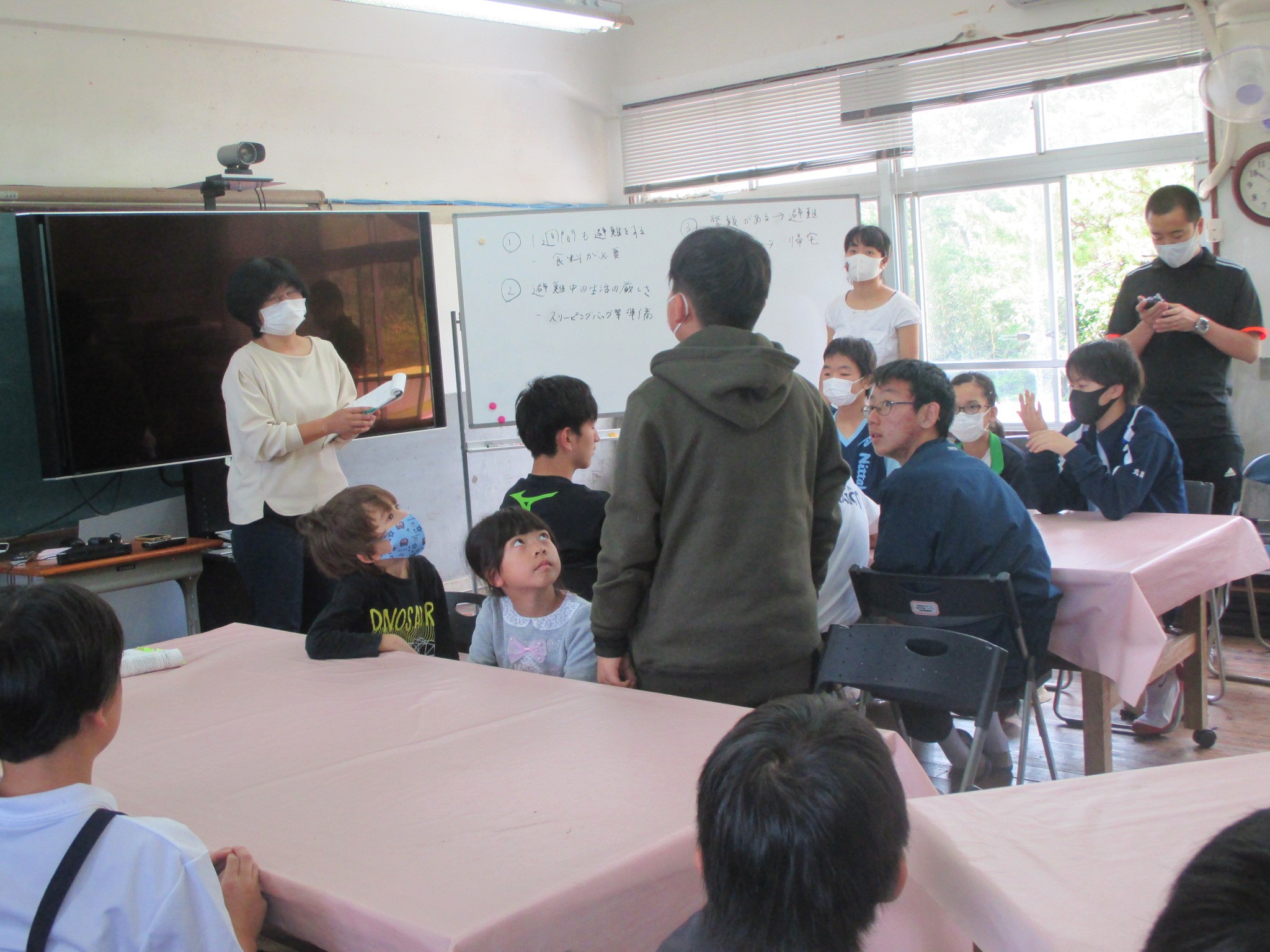 動画で学習した後は,グループで話し合い,意見交換。お互いに気づいたことが違って「命を守る行動」について理解を深められました。