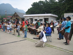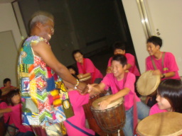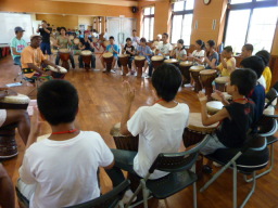 | 夏休みに,硫黄島に三島村の児童生徒が集まり,一緒にジャンベを練習します。 寝食を共にしながらの練習で,3つの島(硫黄島・竹島・黒島)の子ども達はとても仲良くなります。 23年度はママディ・ケイタさんの指導のもと,たくさんの曲を教えていただき,開発センターでコンサートを行いました。 |