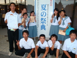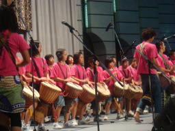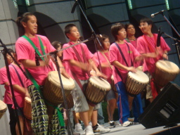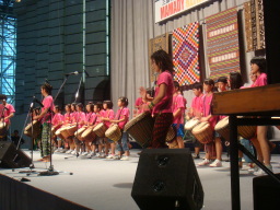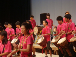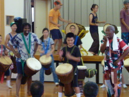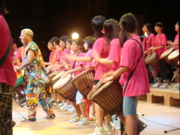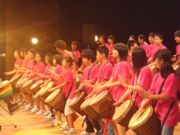 | 毎年,中学生は鹿児島市で開催される夏の祭典に出場します。 練習では,ジャンベスクールの校長先生やジャンベ留学生のみなさんが熱心に教えてくださいます。 平成24年度も金賞を受賞しました! 8年連続金賞受賞です。 |