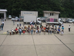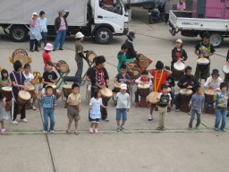 | 新しい友達や先生が島にやってくるときや,今まで一緒に過ごした友達や先生が島を離れるとき,大きなツアーが硫黄島にやってくるときなど, 港でジャンベを演奏して見送りや出迎えをします。 時には地域の方やジャンベ留学生のみなさんと一緒にジャンベを演奏します。 小学3年生以下はリズムに合わせて踊ります。「踊り子さん」と呼ばれ,可愛らしい踊りが大人気です。 |