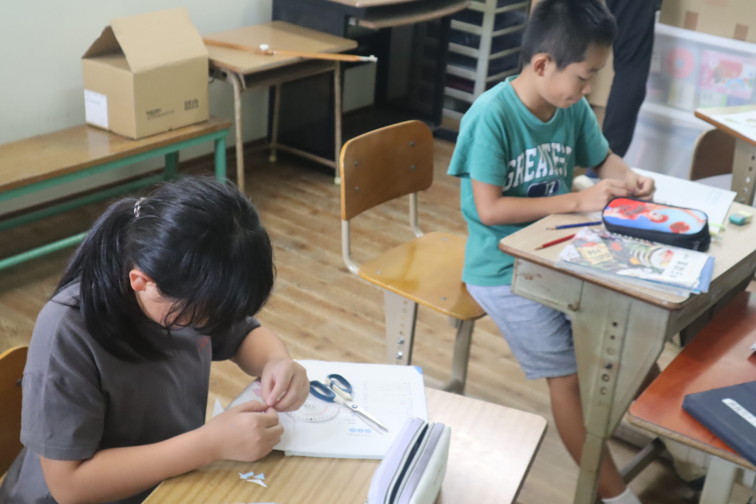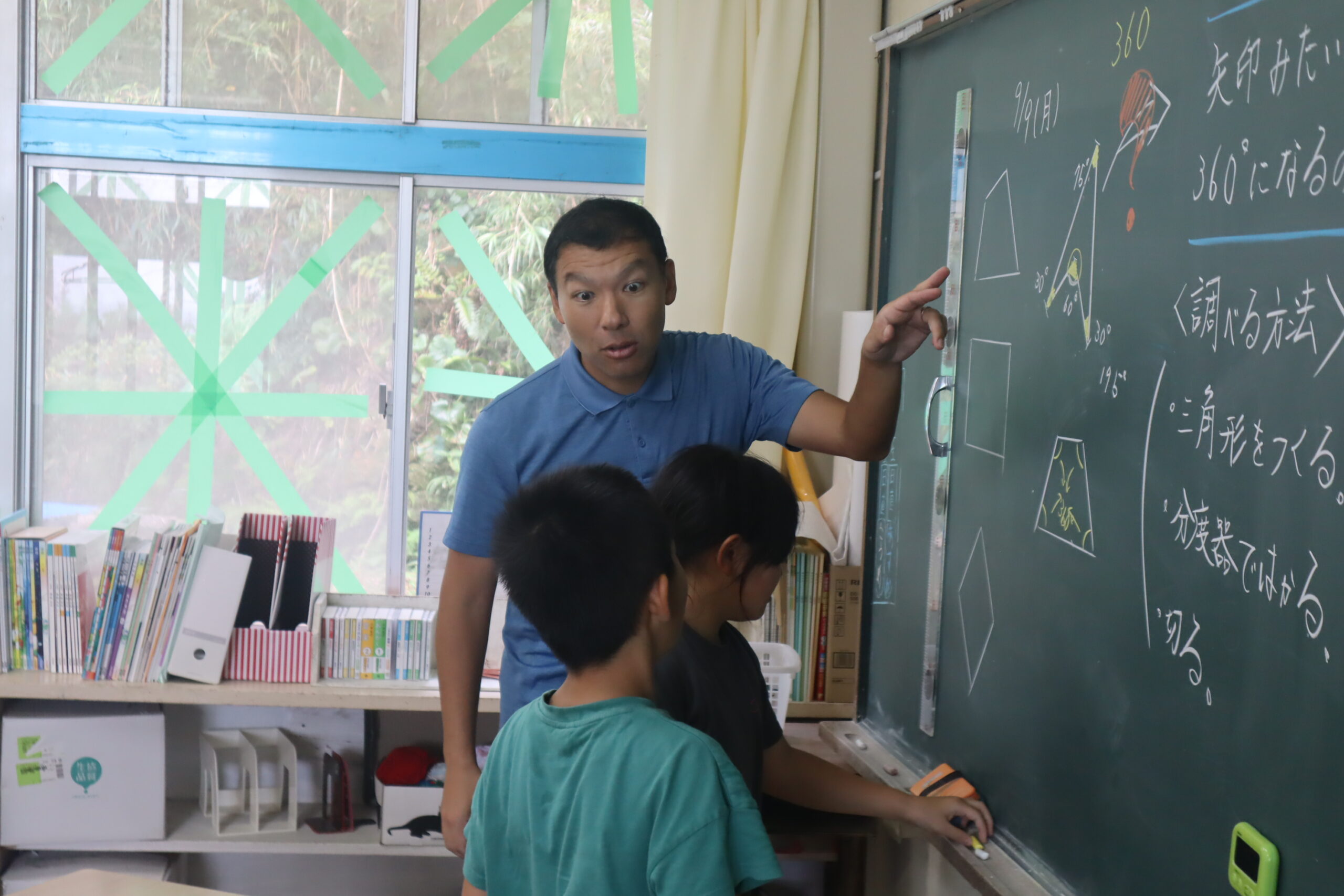 5年生は算数の授業で、変わった形の四角形の角の合計が360度になることを、いろいろな方法で調べました。