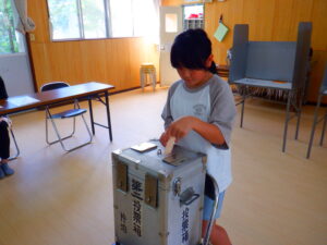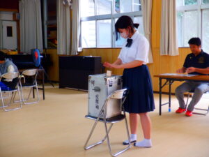 5・6年生と後期課程生を対象に、主権者教育が行われました。選挙管理委員会の方から、自分たちの代表を選挙で選ぶことの大切さや、選挙の仕組みなどを教えていただいた後、実際に模擬選挙を行いました。記載台に向かって立候補者の名前を書き、投票箱に入れる姿は少し緊張気味でしたが、あと数年後には実際に選挙権を得て、有権者となるんだと思うと、なんだか頼もしく見えました。