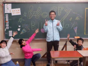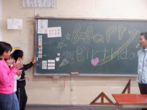 前期課程生の外国語の授業の前に、子ども達がお祝いをしました。