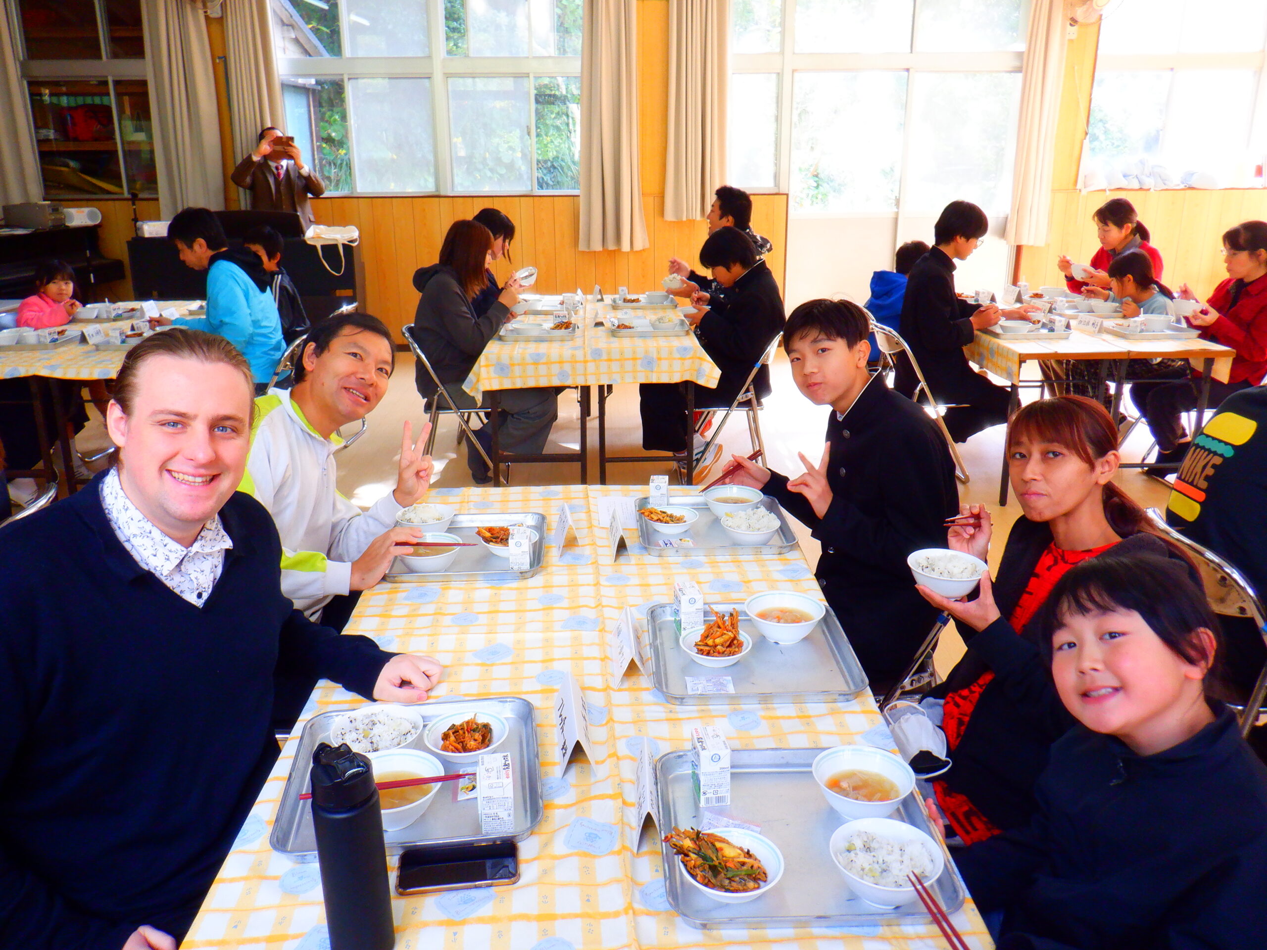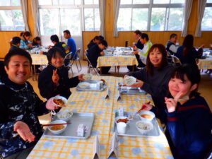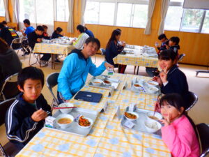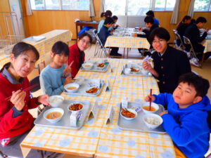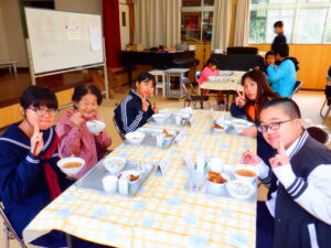 今日の給食は「いも会食」でした。芋の苗植えや芋掘りでお世話になった地区の高齢者の方や無垢の蔵の方々をお招きして,一緒に給食を食べました。今日の給食は「からいもごはん」に「がね」と,さつまいもを使ったメニューでした。秋の味覚を,存分に味わうことができました♪