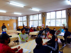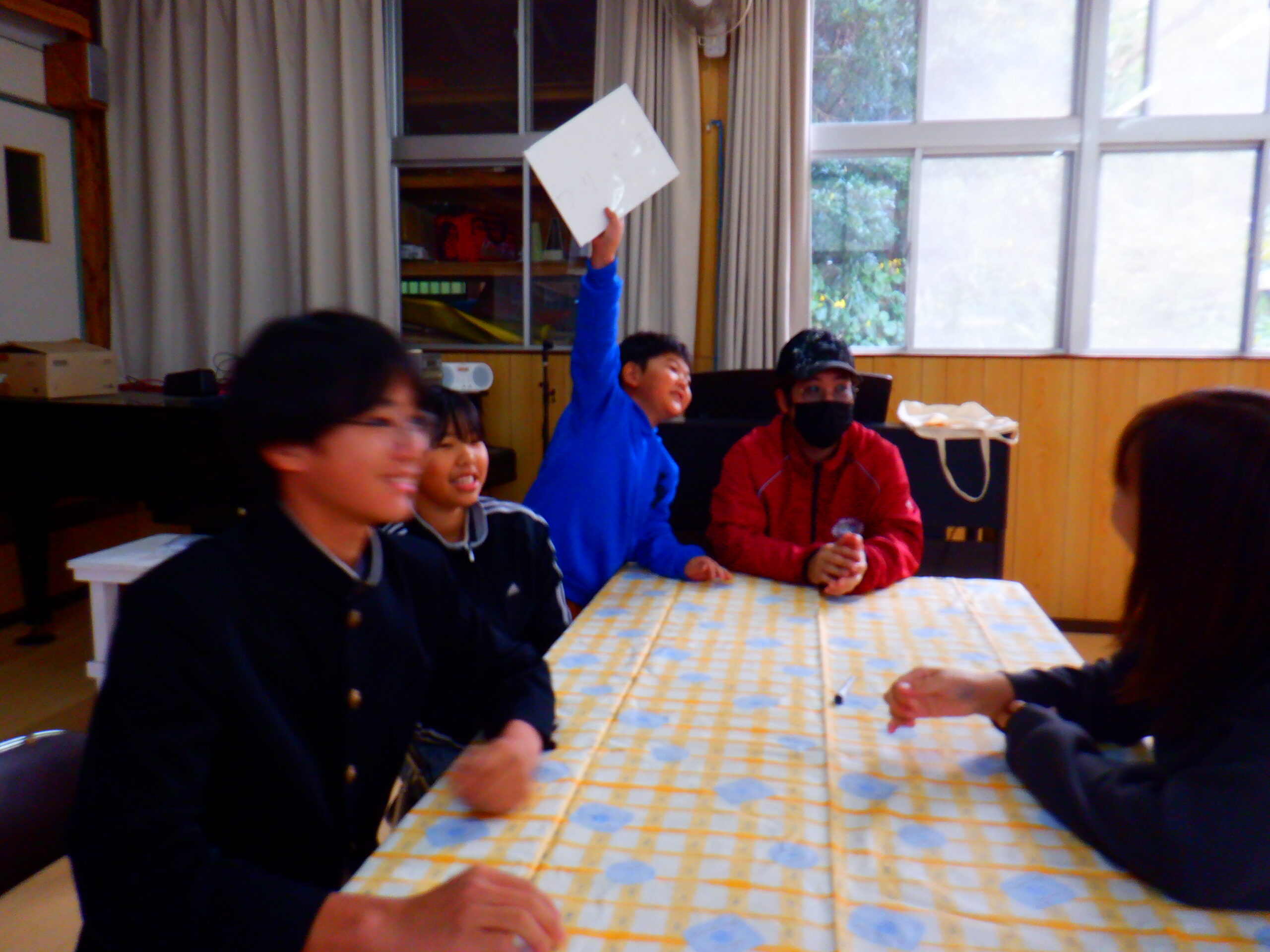 また,給食をいただいた後は,レクリエーションを行いました。内容は「○×クイズ」と「シルエットクイズ」「あたまおしりゲーム」の3つです。この日に向けて準備した児童・生徒の工夫が感じられ,とても楽しい時間になりました♪