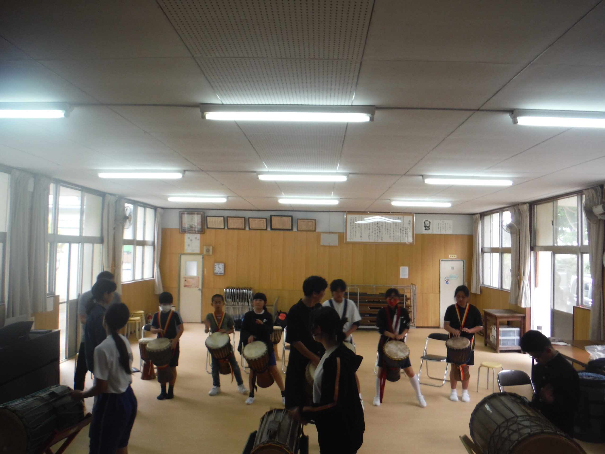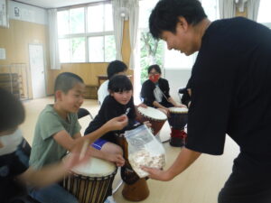 今日は徳田先生がいらっしゃって、6校時にジャンベ教室がありました。 演奏を習う前に、ギニアのおみやげをいただきました。 バオバブの実を乾燥したものです。 6月の万博に向けて、ストラップをつけて、立って演奏しました。 立って演奏するのが初めての子は、ジャンベの重さに、とてもきつそうでした。 これからたくさん練習して、慣れていきましょうね。