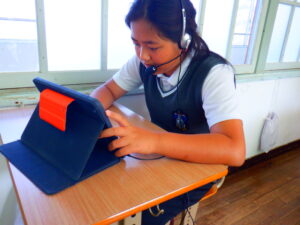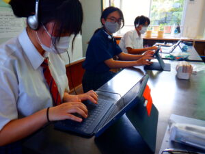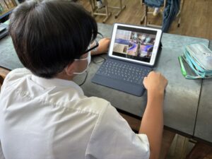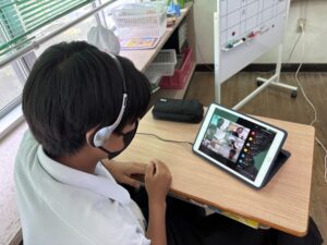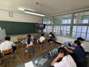 2~3時間目にかけて、鹿児島大学大学院生による後期課程を対象とした遠隔授業がありました。大里学園と片泊学園の合同で行われたこの授業は、「タイムスリップde三島物語」というテーマで黒島の歴史的出来事に自身を登場させて、物語を創作する授業でした。
