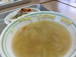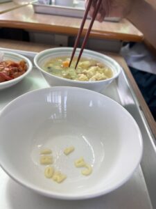 給食の温食でABCスープが出ました。生徒たちはアルファベットの形をしたマカロニがたくさん入っていて、楽しそうに給食を食べていました。
