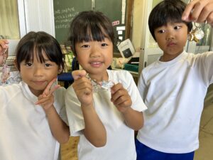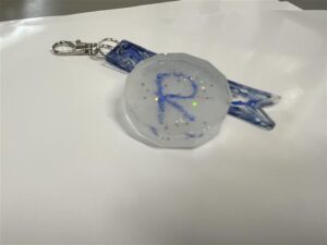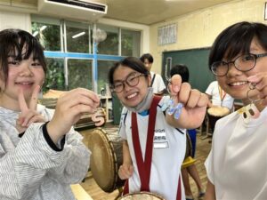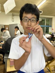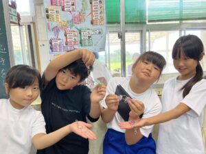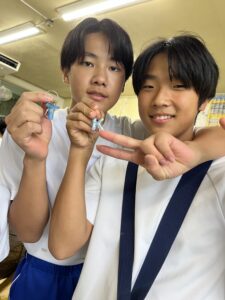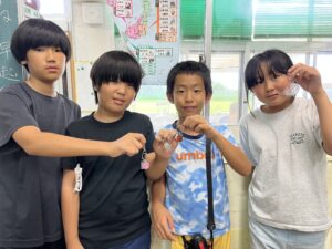 昼休みは、先日の放課後子ども教室(ものづくり)のときに作成したキーホルダーを児童生徒のみなさんに渡しました。「キラキラしてきれい!」「かわいい~!」という声であふれ、みんなとても喜んでくれました。