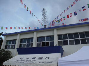校舎の屋上から校庭に向かって万国旗が飾られると、運動会の空気が一気に高まりました。