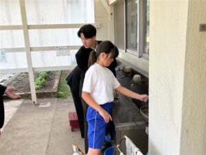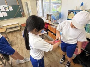 子どもたちは「ここに残ってるよ!」「もっとしっかり洗わないといけないね」と声をかけ合いながら、楽しそうに取り組んでいました。