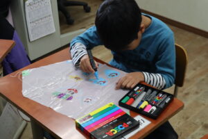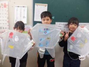 先生と一緒に,楽しそうにたこを作って,思い思いに絵を描いていました。