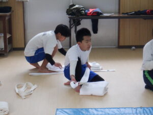 柔道経験者の先生が指導してくださって,まずは柔道着を着るところから始めました。