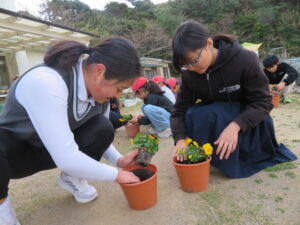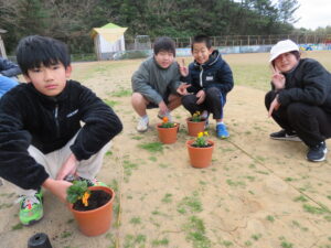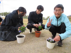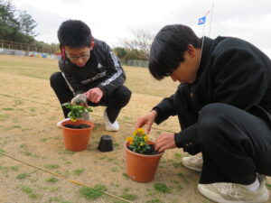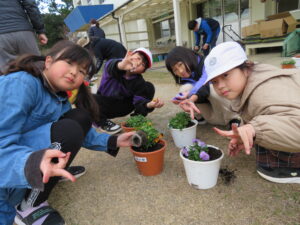 1つめは,苗の植え替えです。ビオラを黒ポットから鉢へと植え替えました。このビオラは,3月にある卒業式・修了式で飾る予定です。9年生と6年生の晴れの門出を,みんなで育てたビオラと共に迎えられたらなと思います。