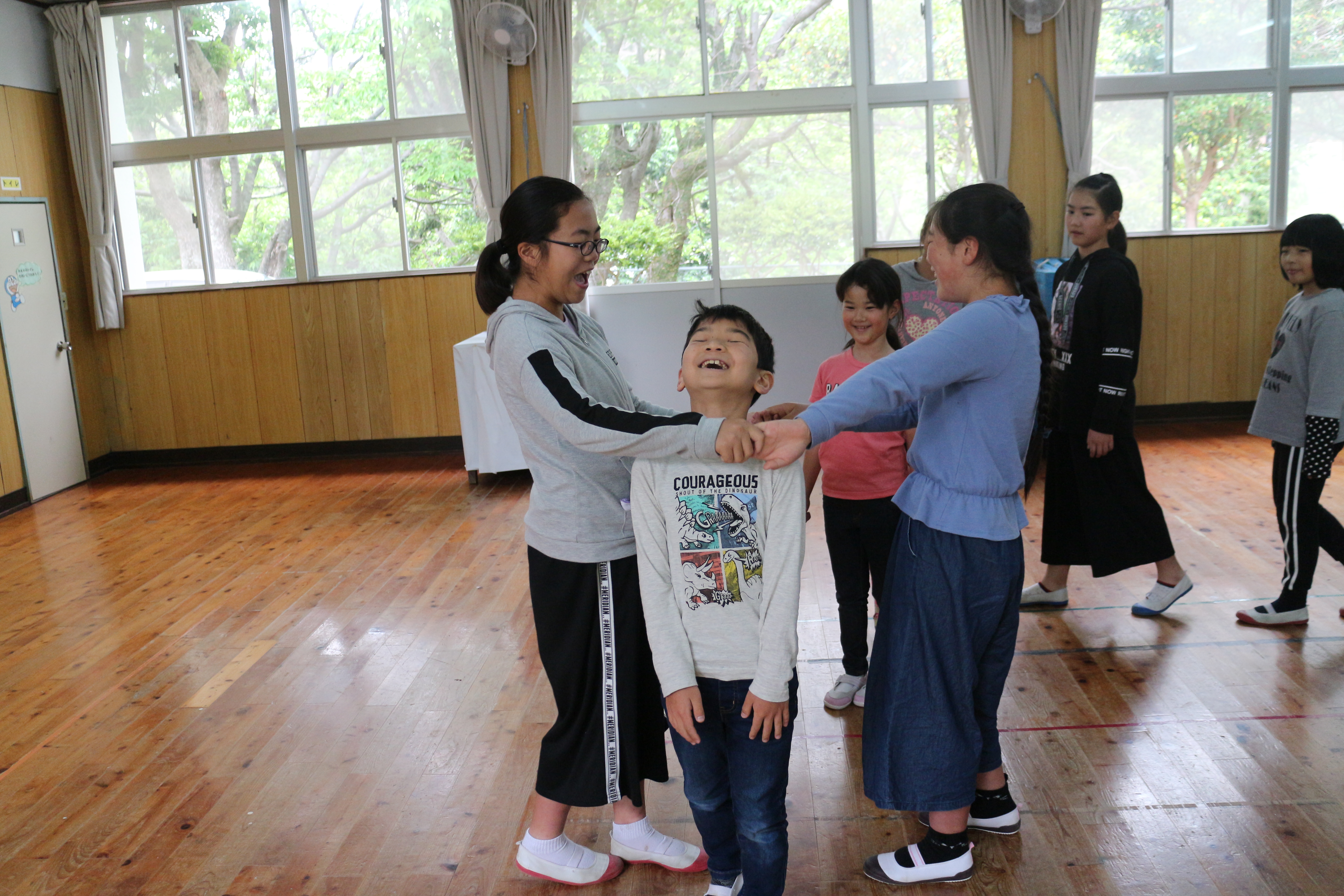 今日の音楽の授業は,小学生全員で「はないちもんめ」や「じゃんけん列車」などの歌遊びをしました。