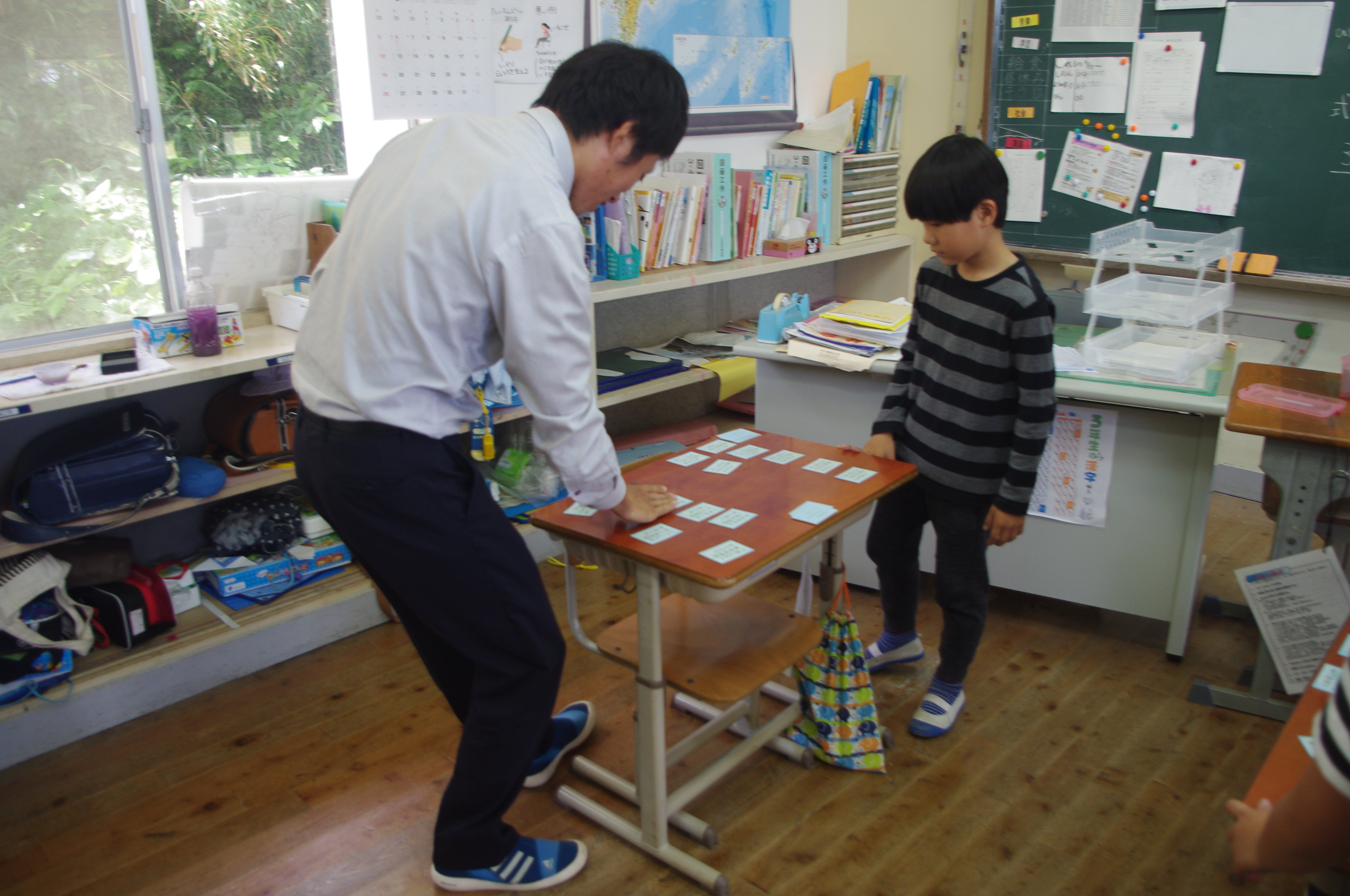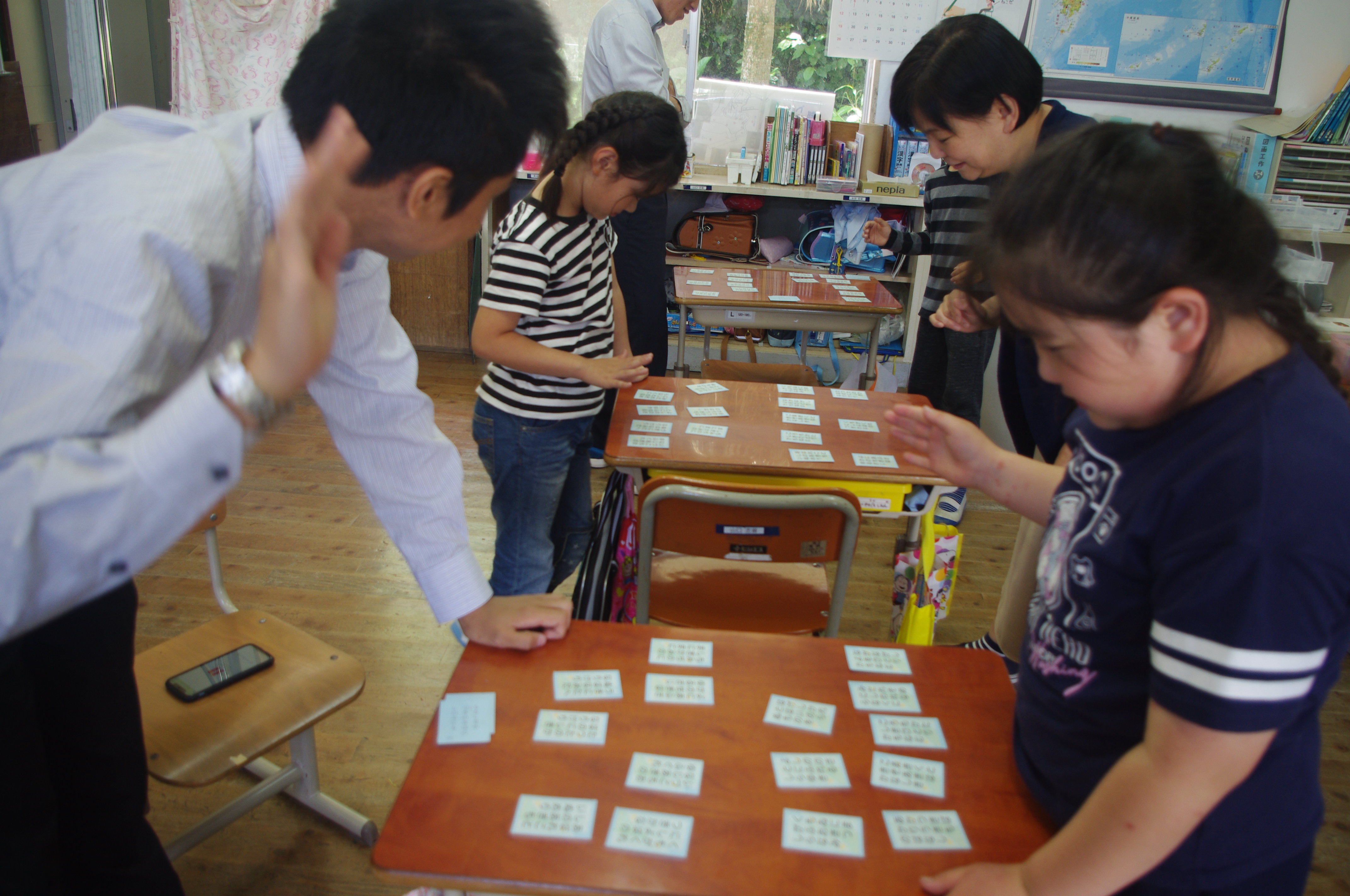3・4年生の子ども達と先生方で5色百人一首の勝負をしました。4月から少しずつ百人一首を覚えてきた子ども達。自分の得意な札や好きな札を取ると大喜び!しかし,勝負には負けてしまいがっかり。まだまだ覚え始めたばかりなので当然です。この悔しさをばねにきっとたくさん覚えてくるでしょう。先生方に勝てる日も近いかもしれません!