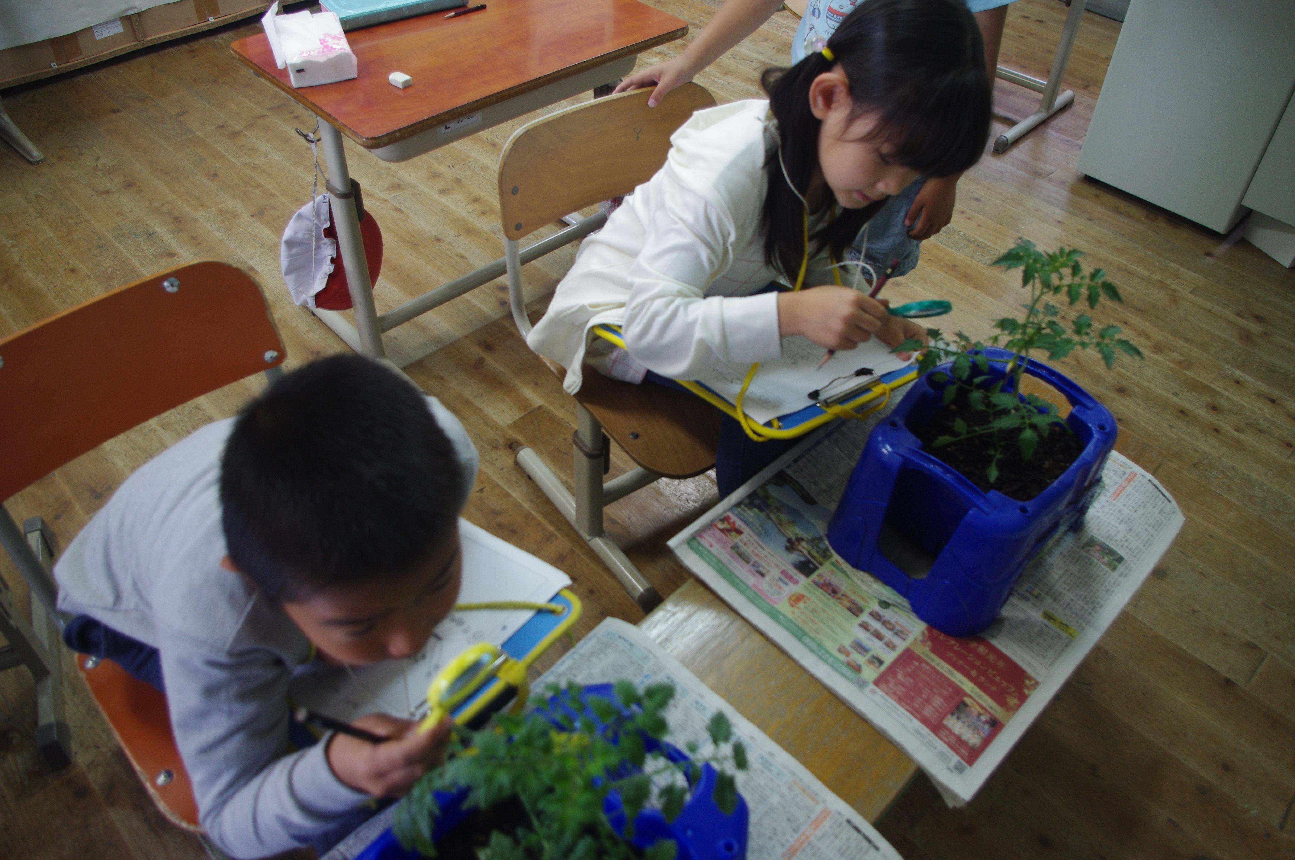 1・2年生が生活科で育てている野菜たちがすくすくと育っています。ミニトマトは,毎日のように収穫できるまでに成長しました。畑には,ピーマン・とうもろこし・オクラ・なすを植えていて,3人が代わる代わる見に行って報告をしてくれます。とうもろこしがもうすぐ収穫できそうで楽しみです!
