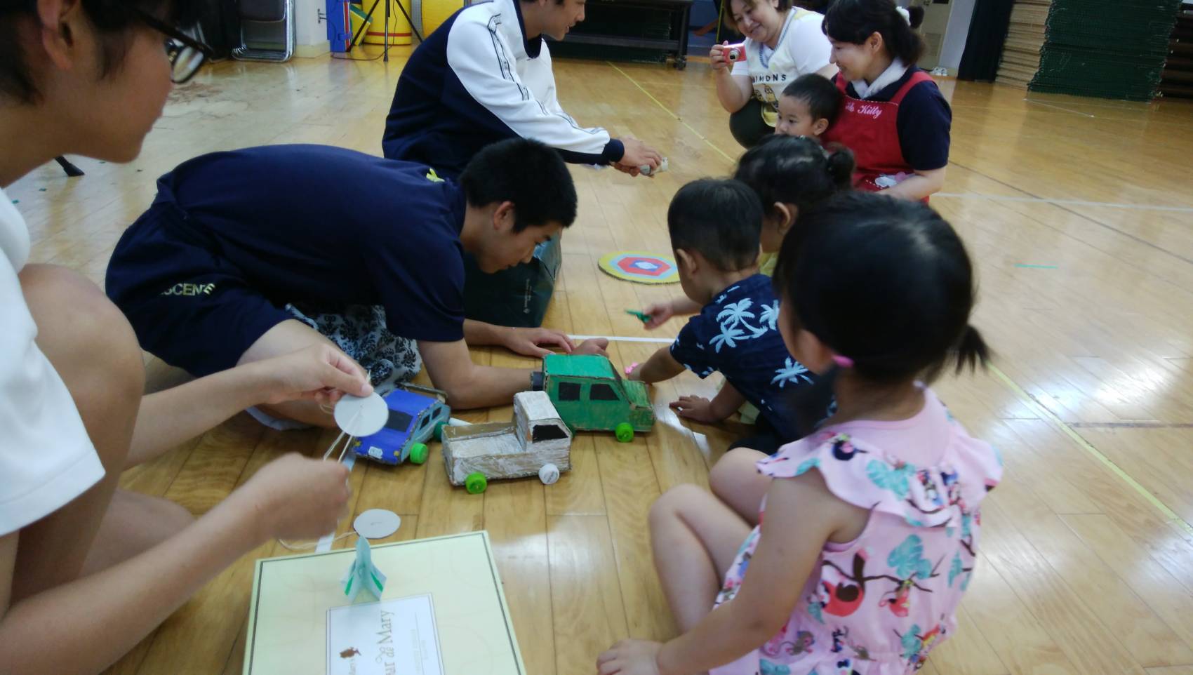 初めはお互いに緊張ぎみでしたが,ふれあい遊びや,かくれんぼをしてすっかり仲良くなり,帰る頃には離れようとしないこどももいました。生徒達もとっても充実した時間を過ごすことができました。