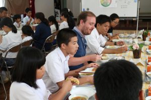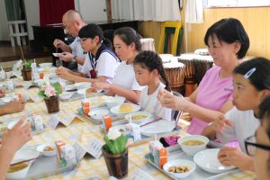 今日は,学期1回計画されている「合同給食」の日でした。本日のメニューは,「かぼちゃパン,じゃがいものインド煮,バナナッツ,みかん果汁,牛乳」でした。みんなで,楽しく会話しながらおいしくいただきました。