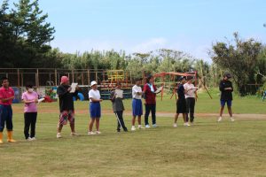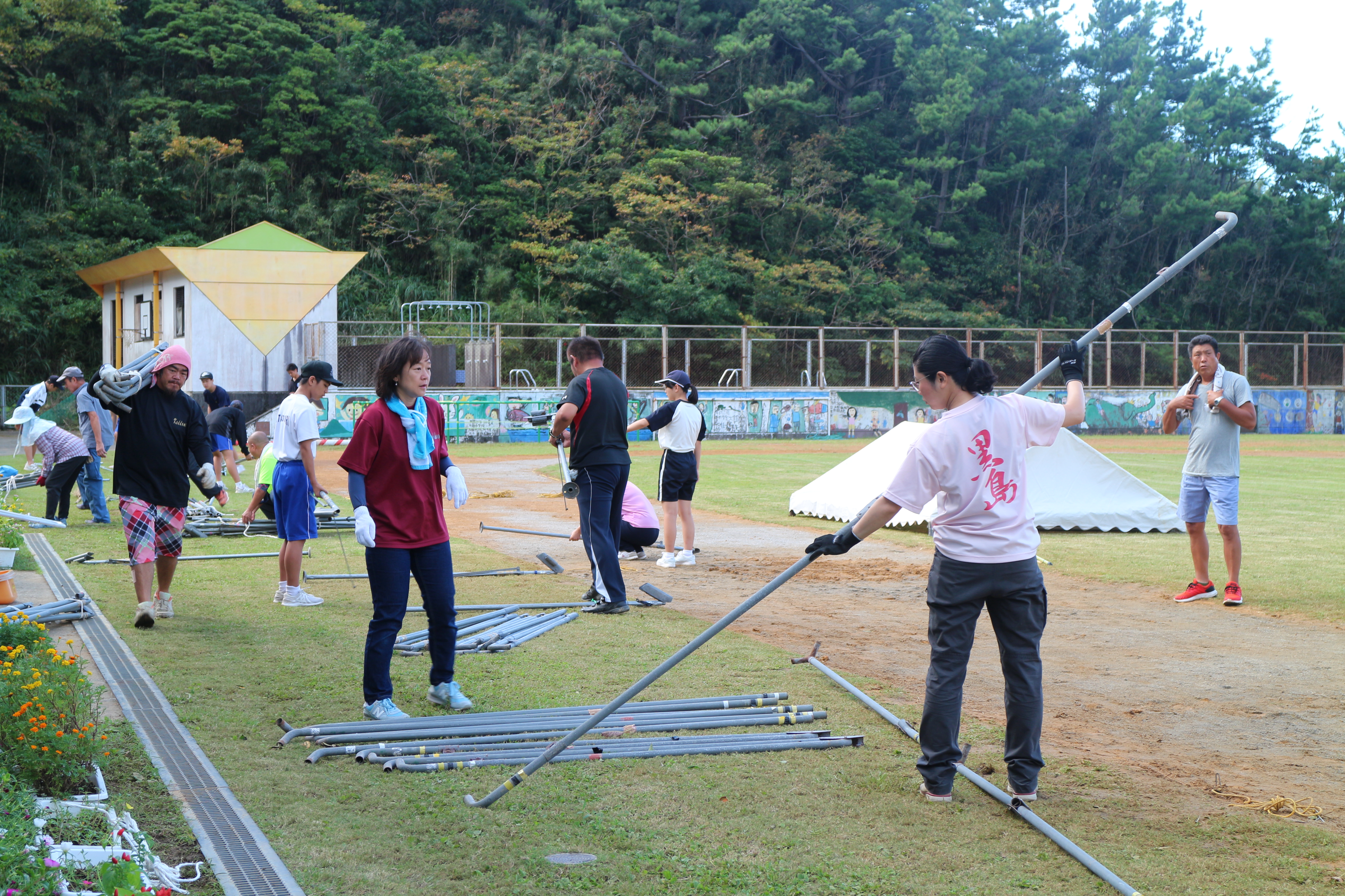 朝から地区の方々の協力をいただきながら、運動会準備を行いました。テント立てや万国旗など力のいる作業や、高所での作業も手慣れた様子でどんどん進めてくださいました。準備のあとは、みんな一緒に応援歌やフォークダンスの練習。いよいよ運動会だという気分も盛り上がってきました。