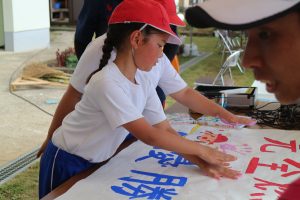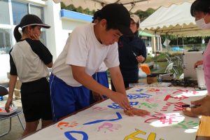 午後からの最後の練習のあとには、児童生徒会が作ったスローガンの垂れ幕に一人一人気合の入った手形を押しました。