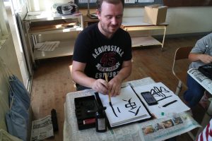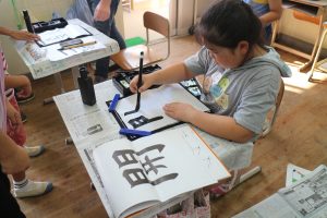 小学3,4年生の書写の時間では,ALTのジェームズ先生と楽しく筆を走らせました。