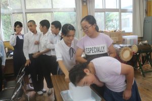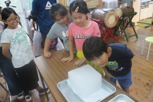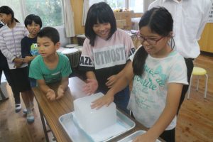 悪天候での船の欠航と重なり、7月から2度にわたって延期となっていた「南極の氷 贈呈式」がついに実施されました。 自衛隊の方から、写真や映像を使って南極についてのお話を伺った後、南極の氷と対面!!氷に閉じ込められた何万年も前の空気がはじける音を聞いたり、ふつうの氷との違いを触って比べたり、めったにできない貴重な体験をすることができました。 いつか、南極にも行ってみたいですね。