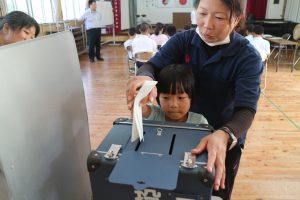 役場から本物の投票箱と記載台をお借りして本物の空気を体感しながら投票を行いました。