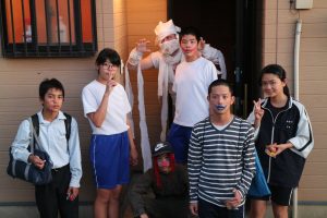 10月31日はハロウィンの日です。 子どもたちはALTのジェームズ先生の家にお菓子をもらいに行きました。 Trick or treat!大きな声でジェームズ先生のお家のドアをたたきました。中からはミイラ男のジェームズ先生が登場。 ビックリしながらも最後は笑顔で記念撮影をしました。