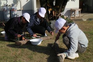 今日の5,6時間目にしいたけの駒打ちがありました。 クヌギの木に専用のドリルで20センチ間隔に穴を開けて、しいたけ菌が付いた種駒を植えました。 しいたけは発生するまでに2年かかります。 2年後を楽しみに、これから毎日しいたけを観察していきたいと思います。