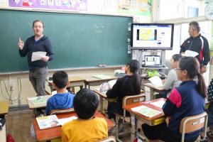 片泊小・中学校の児童・生徒はジェームス先生に英語をならっています。日本人の先生もいて,わかりやすい説明と本物の発音でメキメキ英語力をつけています。