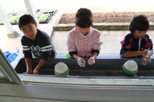 今日,小学1・2年生は手洗いの勉強をしました。 普段の手洗いをしてから,ブルーライトできれいになったか確認してみると,子どもたちの手にはまだまだ汚れが・・・。子どもたちも「きたない!!」と驚いていました。 “あわあわ手洗いの歌”に合わせて,正しく手を洗うと,とてもきれいになりました。ピカピカになった手を見て,とても嬉しそうでした♪ これから,風邪やインフルエンザが流行る時期になります。しっかり予防して,冬も元気に過ごしてほしいです。