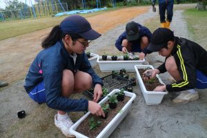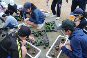 一人一つのプランターをもらって、ビオラやパンジーの花を自分のプランターに植えました。