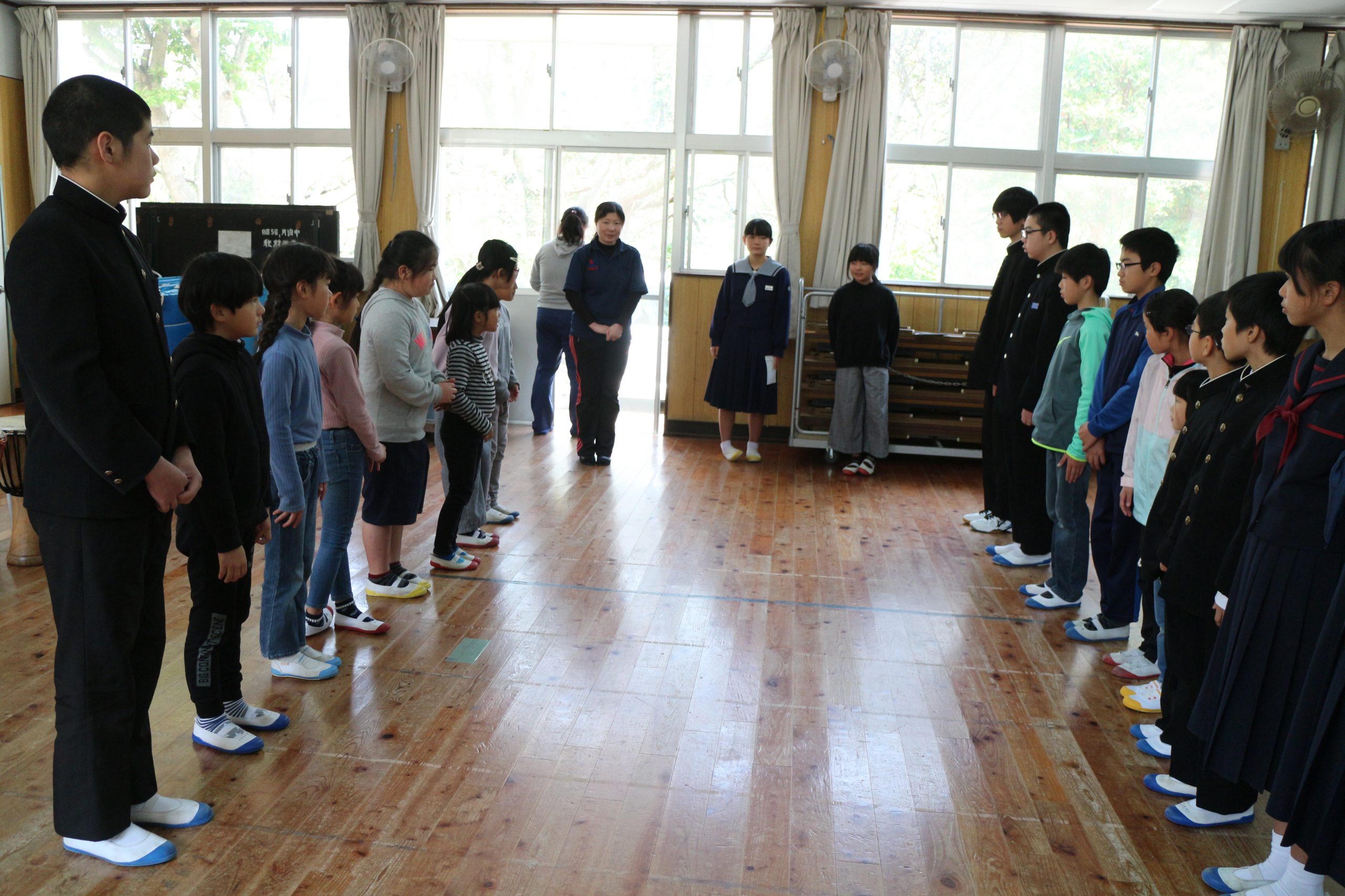 今日は、新1年生・7年進級生・転入生を迎える会を児童生徒会本部の運営で行いました。片泊学園の1年をスライドで説明した後、「猛獣がりへいこうよ」と「じゃんけん列車」のゲームをしました。新入生・転入生も在校生も先生方もみんなでめいいっぱい楽しんで、ぐっと仲良くなった会となりました。