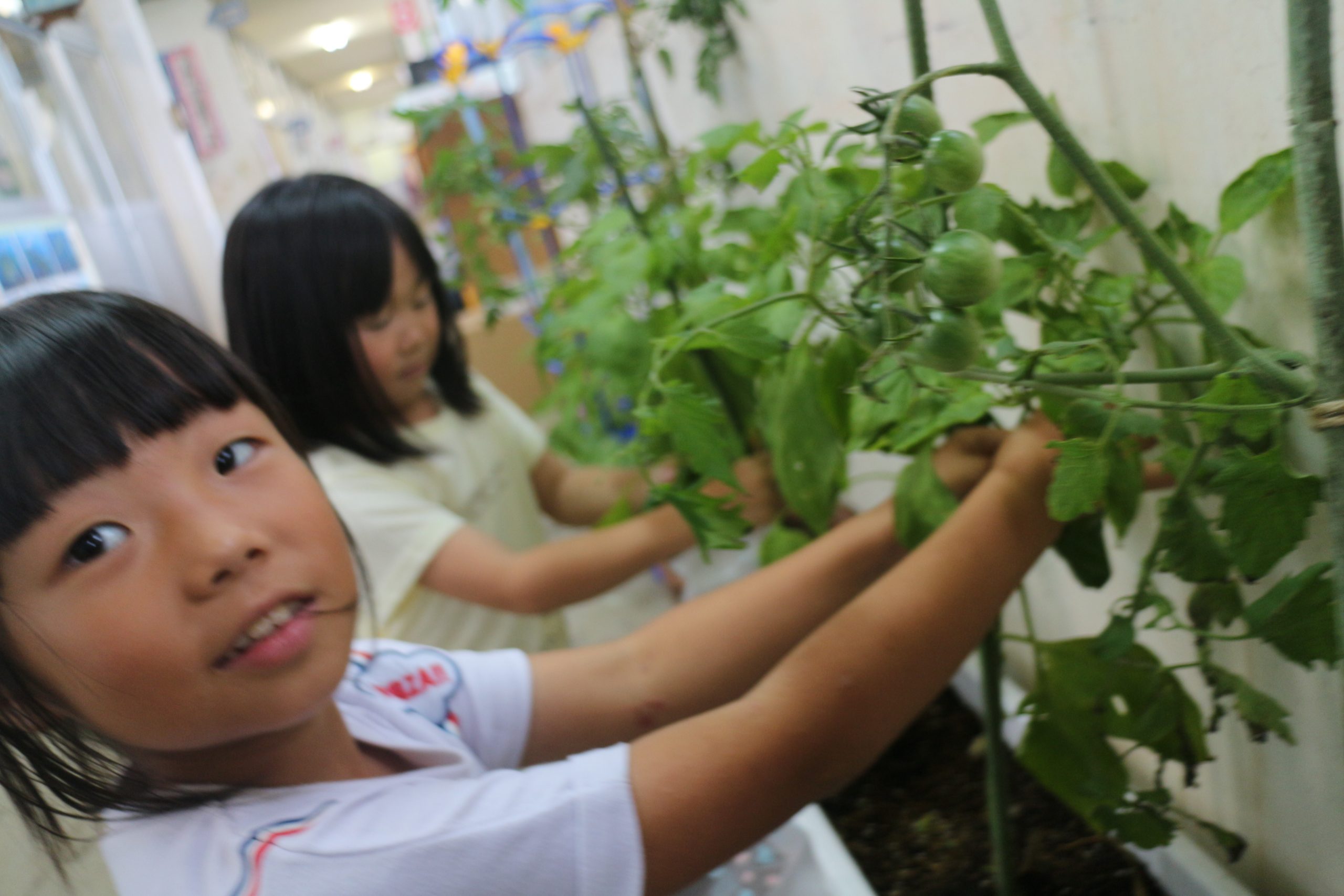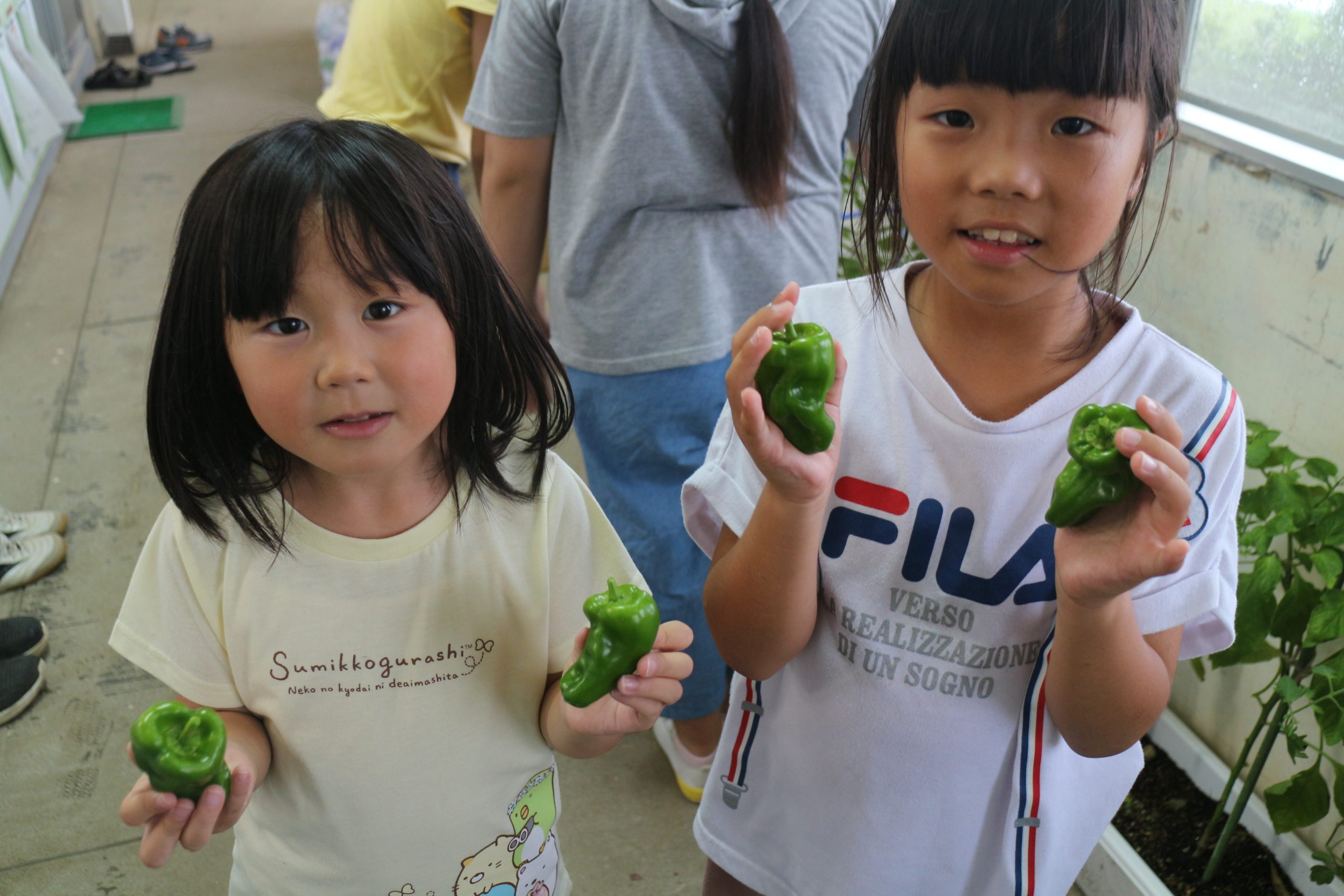 1,2年生は、大切に育ててきたピーマンの初収穫で大喜び。「肉詰め作ってもらう!!」と大切に持ち帰っていました。