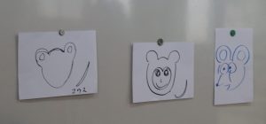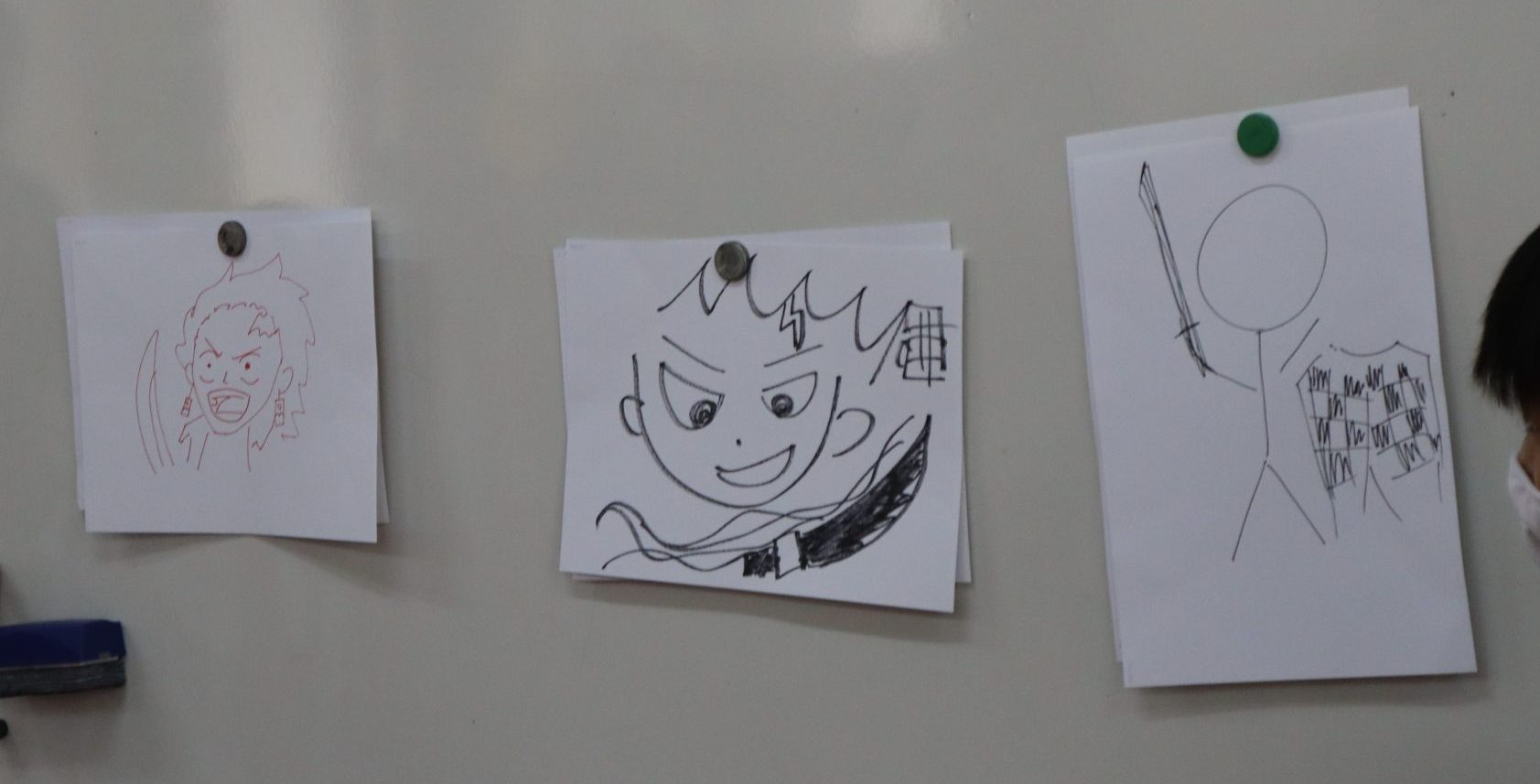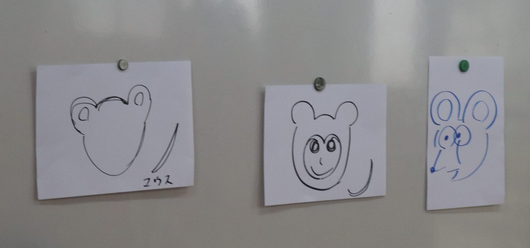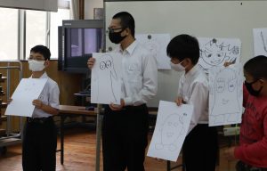 児童生徒朝会は、文化委員会が「進行」、生活委員会が「今日の活動」を担当して運営されています。 今朝は、与えられたお題の絵を先生方が30秒で描き、子どもたちがだれが書いた絵か当てるゲームをしました。 写実的な作品あり、芸術的な作品ありで、子どもたちも楽しそうに誰の作品か、推理していました。 さあ、ここに描かれたキャラクターは何か分かりますか?